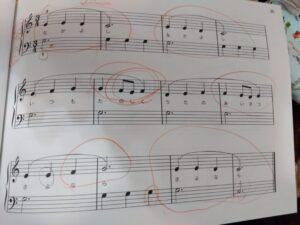 さぁ〜Hくん、お家でれんしゅうの時に、🔴赤丸のところ、注意して練習してね🎹
